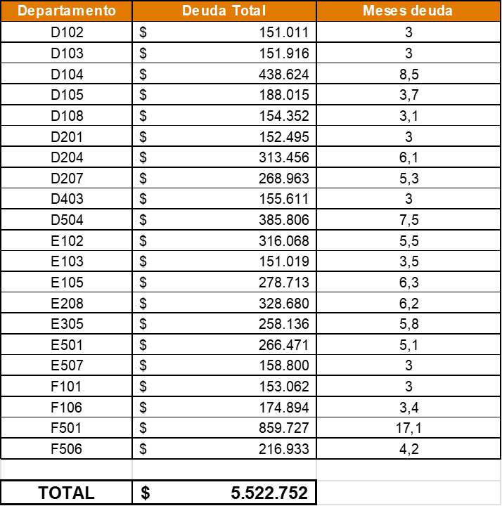En conformidad con la Ley de Copropiedad Inmobiliaria, se adjunta listado de unidades cuya deuda de gastos comunes sobrepasan los 3 meses de deuda y, por consecuencia, son afectos a corte de suministro eléctrico.
