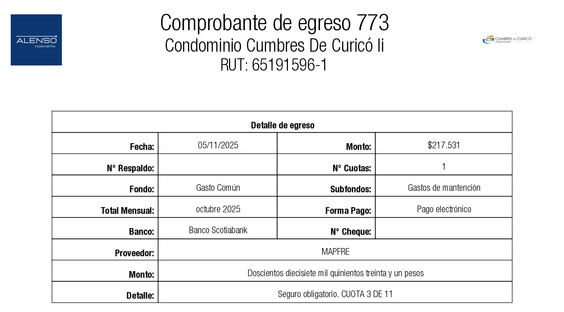 - SEGURO OBLIGATORIO ESPACIOS COMUNES (ítem 3.2): dice "CUOTA 1 DE 11". Debe decir "CUOTA 3 DE 11".